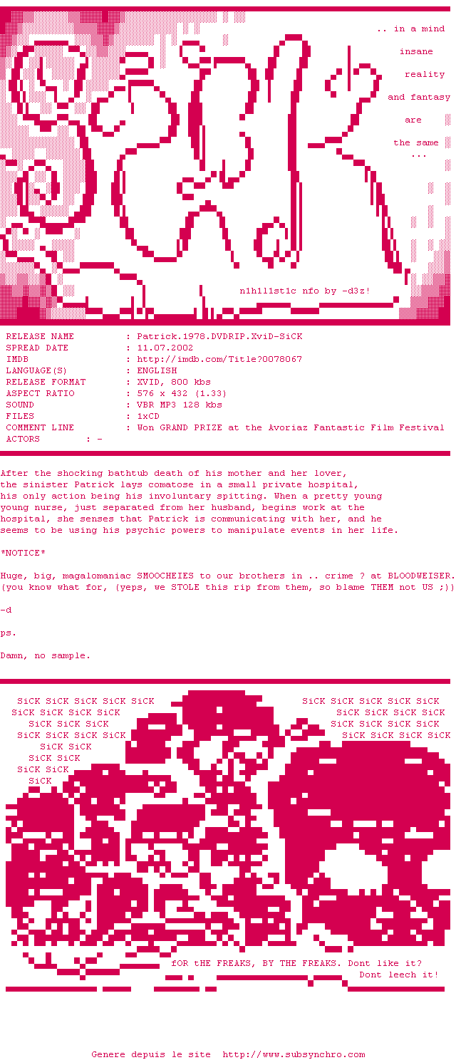 Voir le nfo de la release Patrick.1978.DVDRIP.XviD-SiCK