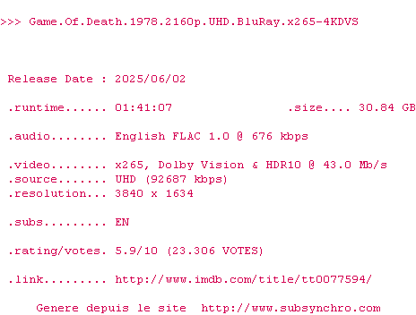 Je ne sais pas comment les gens l'ont pris à l'époque, mais de voir pendant plus de 65% du film un acteur qui n'est pas le bon et des ajouts de bruits et de cris lors des scènes d'action est pour le moins pénible ! Histoire simplette, sans grand intérêt avec les combats intemporels que tout le monde connaît. Vu sans plaisir et même si le son annoncé était en très haut débit, j'ai trouvé beaucoup scène désagréables au niveau audio.