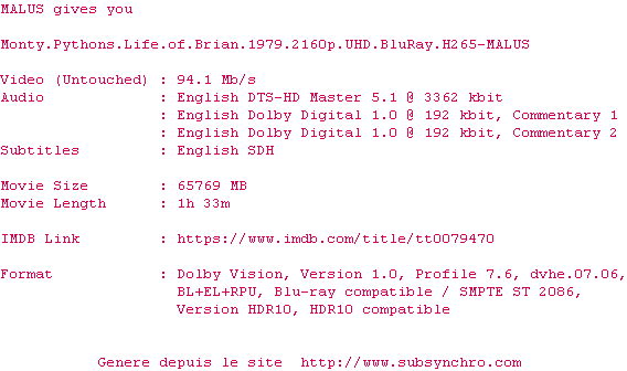 Y avez-vous pense ? Nous proposons déjà 1660 sous-titres pour le film Monty Python : La Vie de Brian. Avez-vous essaye de voir si ces sous-titres etaient compatibles avec cette release ? On vous laisse le soin de tester cela pour nous et de contribuer au site en postant le sous-titre en cas de compatiblite constatee !