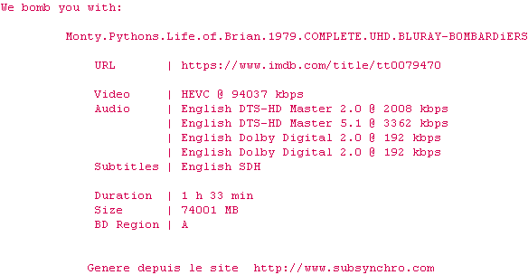 Y avez-vous pense ? Nous proposons déjà 1660 sous-titres pour le film Monty Python : La Vie de Brian. Avez-vous essaye de voir si ces sous-titres etaient compatibles avec cette release ? On vous laisse le soin de tester cela pour nous et de contribuer au site en postant le sous-titre en cas de compatiblite constatee !