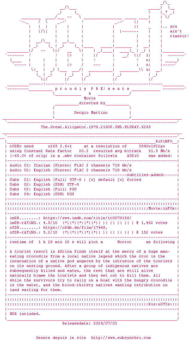 Voir le nfo de la release The.Great.Alligator.1979.2160P.UHD.BLURAY.x265-WATCHABLE