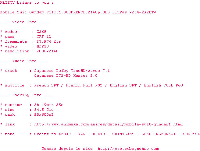 Voir le nfo de la release Mobile.Suit.Gundam.Film.1.SUBFRENCH.2160p.UHD.BluRay.x265-KAZETV