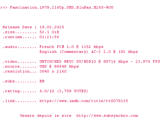 Voir le nfo de la release Fascination.1979.2160p.UHD.BluRay.H265-WOU