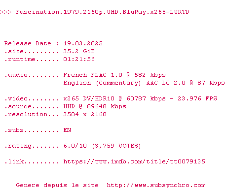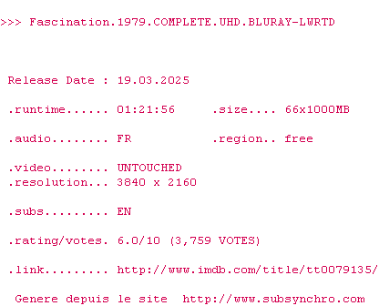 Voir le nfo de la release Fascination.1979.COMPLETE.UHD.BLURAY-LWRTD