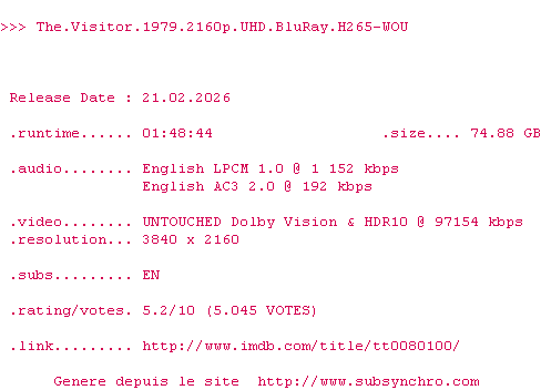 La release The.Visitor.1979.2160p.UHD.BluRay.H265-WOU est en 4K