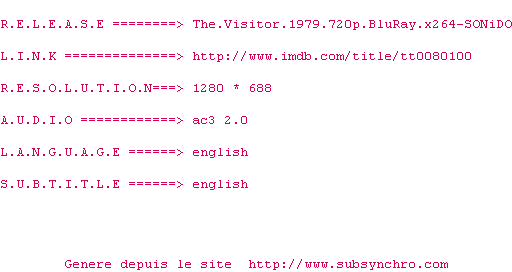 Telechargez le RSS « Fichier de la release The.Visitor.1979.720p.BluRay.x264-SONiDO »