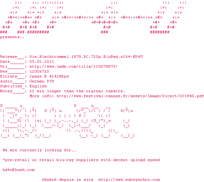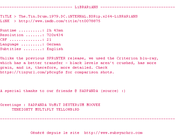 Voir le nfo de la release The.Tin.Drum.1979.DC.iNTERNAL.720p.BluRay.x264-LiBRARiANS