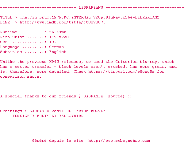 Voir le nfo de la release The.Tin.Drum.1979.DC.iNTERNAL.BDRip.x264-LiBRARiANS