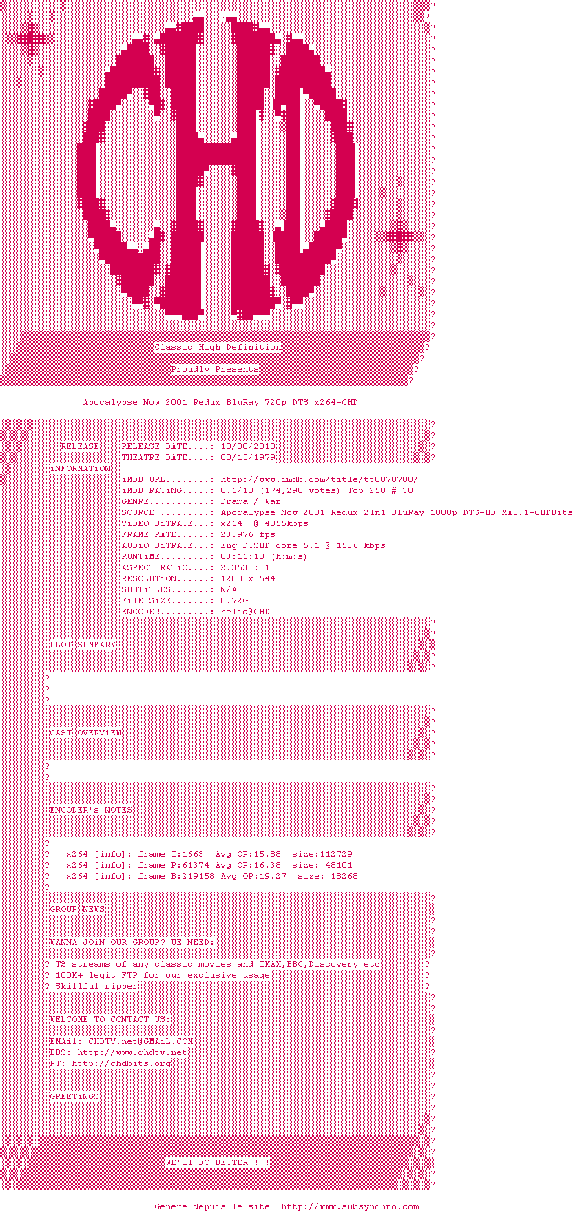 Telechargez le RSS « Fichier de la release Apocalypse.Now.2001.Redux.BluRay.720p.DTS.x264-CHD »