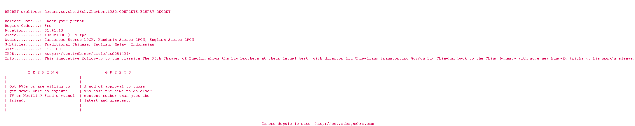 Voir le nfo de la release Return.To.The.36th.Chamber.1980.COMPLETE.BLURAY-REGRET