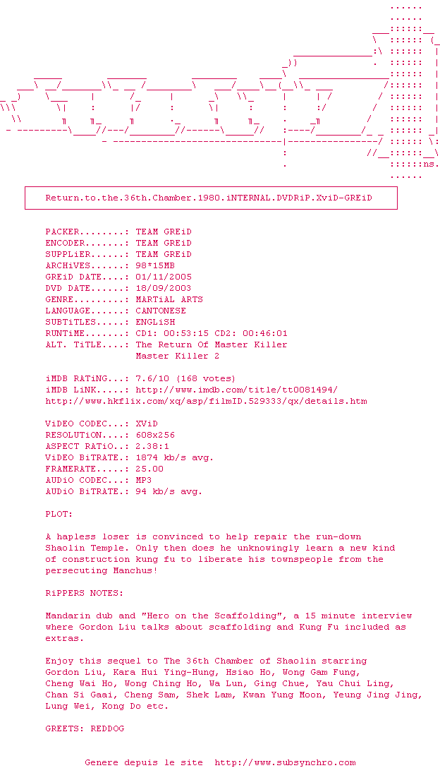 Voir le nfo de la release Return.To.The.36th.Chamber.1980.iNTERNAL.DVDRiP.XviD-GREiD