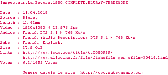 Y avez-vous pense ? Nous proposons déjà 2084 sous-titres pour le film Inspecteur la bavure. Avez-vous essaye de voir si ces sous-titres etaient compatibles avec cette release ? On vous laisse le soin de tester cela pour nous et de contribuer au site en postant le sous-titre en cas de compatiblite constatee !
