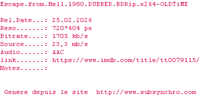Telechargez le RSS « Fichier de la release Escape.From.Hell.1980.DUBBED.BDRip.x264-OLDTiME »