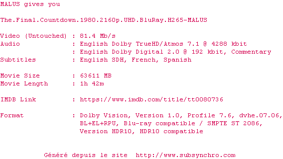 Voir le nfo de la release The.Final.Countdown.1980.2160p.UHD.BluRay.H265-MALUS