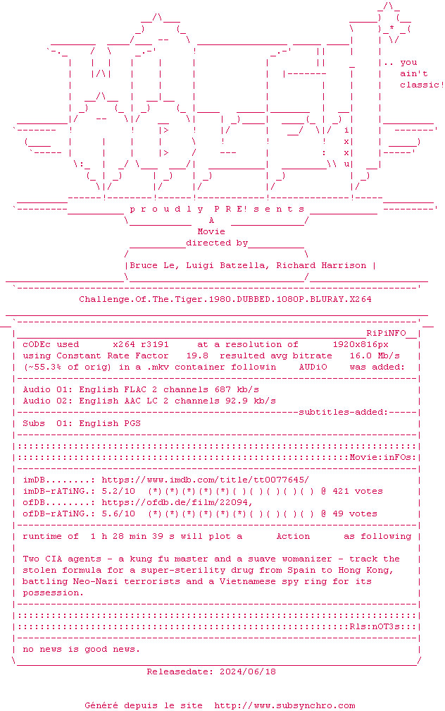 Voir le nfo de la release Challenge.Of.The.Tiger.1980.DUBBED.1080P.BLURAY.x264-WATCHABLE