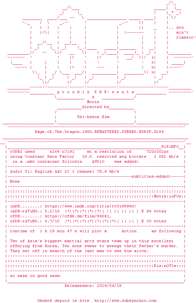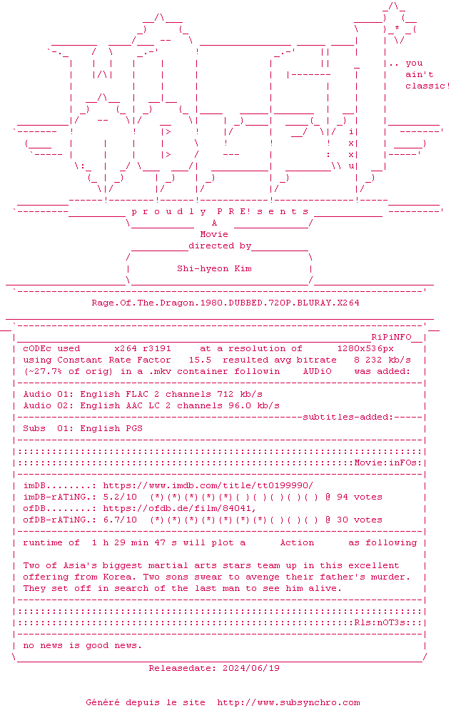 Voir le nfo de la release Rage.Of.The.Dragon.1980.DUBBED.720P.BLURAY.x264-WATCHABLE