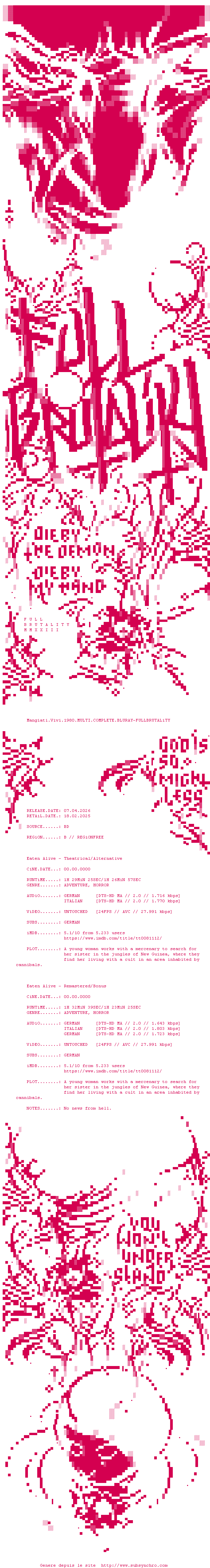 Y avez-vous pense ? Nous proposons déjà 1524 sous-titres pour le film La Secte des cannibales / Eaten Alive!. Avez-vous essaye de voir si ces sous-titres etaient compatibles avec cette release ? On vous laisse le soin de tester cela pour nous et de contribuer au site en postant le sous-titre en cas de compatiblite constatee !