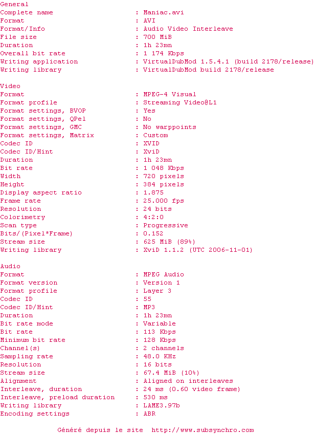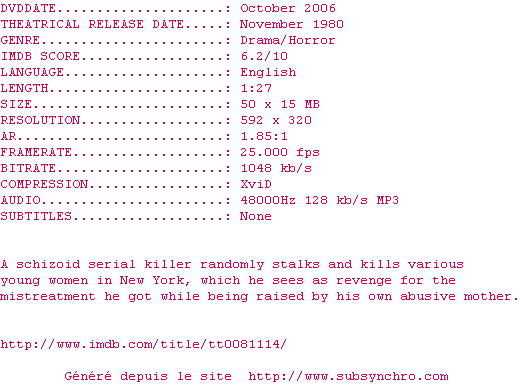 Voir le nfo de la release Maniac.1980.BDRiP.AC3-5.1.XviD-SiC