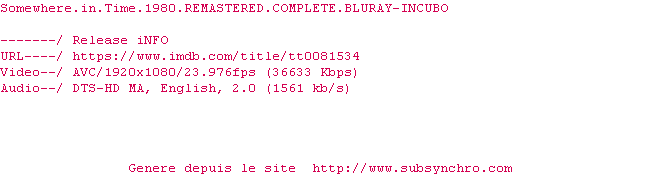 Y avez-vous pense ? Nous proposons déjà 1198 sous-titres pour le film Quelque part dans le temps. Avez-vous essaye de voir si ces sous-titres etaient compatibles avec cette release ? On vous laisse le soin de tester cela pour nous et de contribuer au site en postant le sous-titre en cas de compatiblite constatee !