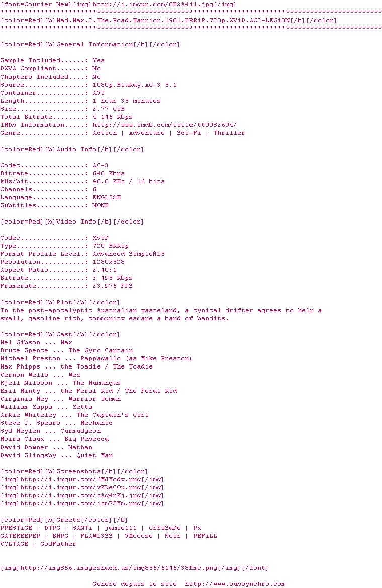 Voir le nfo de la release Mad.Max.2.The.Road.Warrior.1981.BRRiP.720p.XViD.AC3-LEGi0N