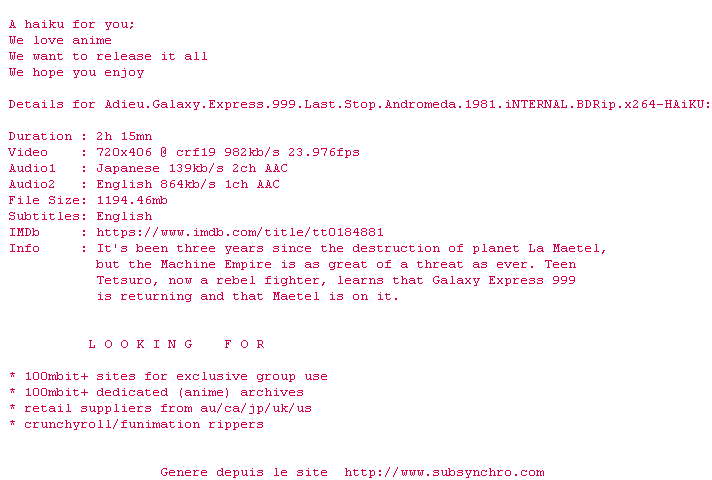 Y avez-vous pense ? Nous proposons déjà 1608 sous-titres pour le film Adieu Galaxy Express 999. Avez-vous essaye de voir si ces sous-titres etaient compatibles avec cette release ? On vous laisse le soin de tester cela pour nous et de contribuer au site en postant le sous-titre en cas de compatiblite constatee !
