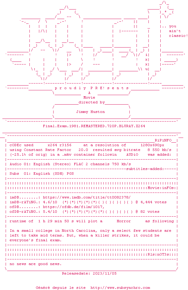 Voir le nfo de la release Final.Exam.1981.REMASTERED.720P.BLURAY.x264-WATCHABLE