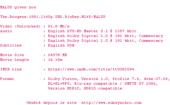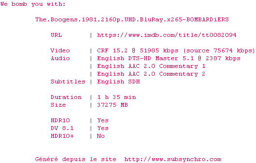 Voir le nfo de la release The.Boogens.1981.2160p.UHD.BluRay.H265-MALUS