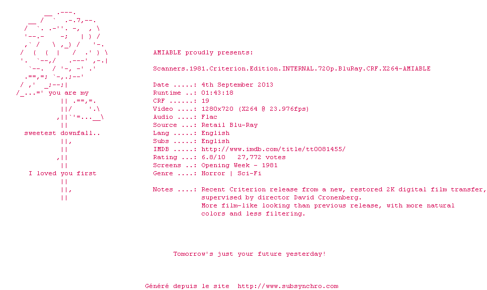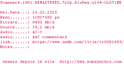 Le commentaire de Takuandaichi Commente par Takuandaichi (49), Le Samedi 20 Septembre 2014 à 17h31 Très bon film de SF anticipation/futur proche. Un rythme assez lent, de bonnes interprétations, si vous voulez voir le meilleur rôle (et le plus flippant) de Michael Ironside, c'est ici ! Il est simplement génial, m^me si on finit par se dire que les enfants de l'acteur auront du mal à grandir sainement... (un peu comme les gosses de Brad Dourif, quoi) Rôle principal bien vu et bien joué, sans être inoubliable pour autant. Le reste est du pur Cronenberg, effets spéciaux organiques et suintants, pouvoirs terrifiants qui ne devraient pas être attribués aux humains, bande-son minimaliste qui met mal à l'aise (ça aurait pu être joué et utilisé par Carpenter) Un classique de la SF années 80, donc, à voir au moins une fois dans sa vie, pas trop fatigué. A peu près autant d'action que Alien premier du nom. Vous voilà prévenu. 7.5 / 10 0 0