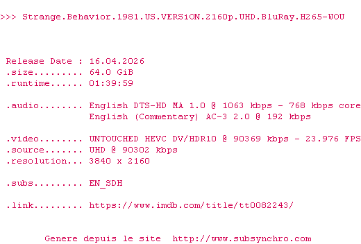 La release Strange.Behavior.1981.US.VERSiON.2160p.UHD.BluRay.H265-WOU est en 4K