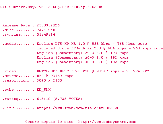 Y avez-vous pense ? Nous proposons déjà 1326 sous-titres pour le film Cutter's Way : La Blessure. Avez-vous essaye de voir si ces sous-titres etaient compatibles avec cette release ? On vous laisse le soin de tester cela pour nous et de contribuer au site en postant le sous-titre en cas de compatiblite constatee !