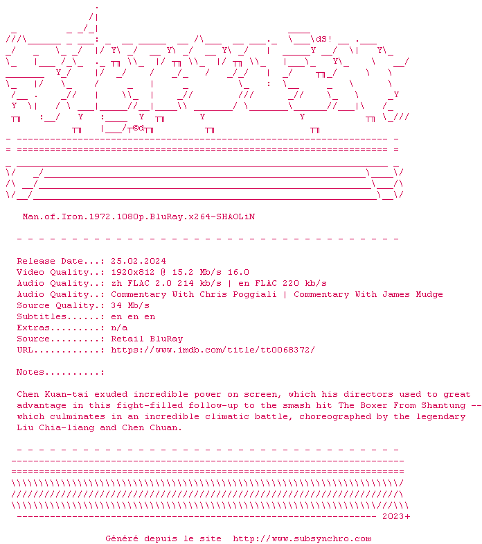 | Voir le nfo de la release Man.Of.Iron.1972.1080p.BluRay.x264-SHAOLiN | SHAOLiN | Man.Of.Iron.1972.1080p.BluRay.x264-SHAOLiN OpenSubtitles | 0 fichier | ||