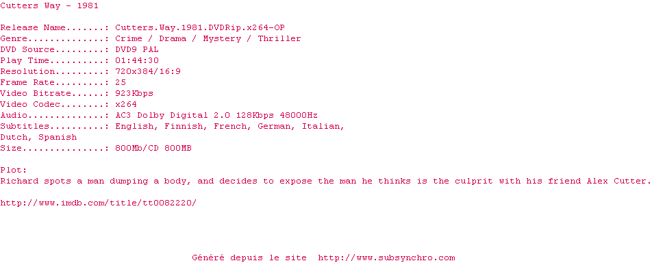 Telechargez le RSS « Fichier de la release Cutters.Way.1981.DVDRip.x264-OP »