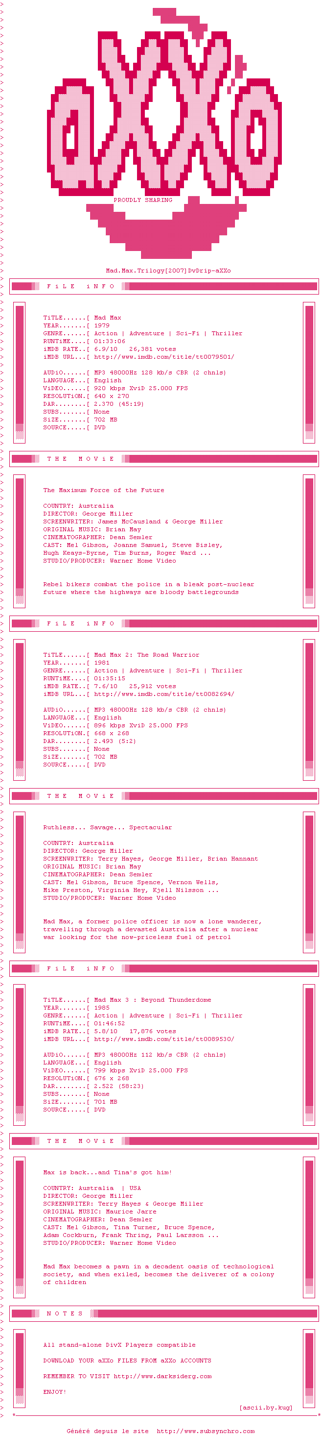 Telechargez le RSS « Fichier de la release Mad.Max.2.The.Road.Warrior.1981.DVDRip-aXXo »