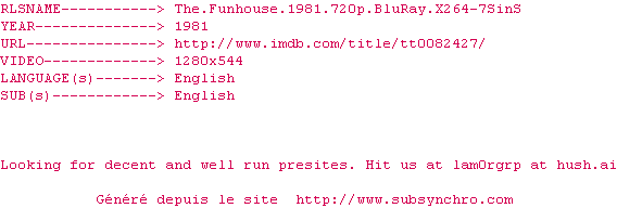 The.Funhouse.1981.720p.BluRay.DTS.x264-7SinS.srt Ajouté par Dzoolander Ajoute le 07-01-2014 21:19:11 Format : SRT Italique : Oui Taille : 0.00Ko Telechargement : 79 Sous-titre Extrait d'un DVD Z1 Ajouter cette release à ma collection en cas de telechargement des sous-titres 0 0 0 Telecharger le ZiP contenant NFO, Affiche, Sous-titre (*.srt) Commentez le fichier The.Funhouse.1981.720p.BluRay.DTS.x264-7SinS.srt Commentez le fichier The.Funhouse.1981.720p.BluRay.DTS.x264-7SinS.srt Commentez ce fichier Le fichier 12150-1389125951.srt n'existe pas ! Telechargez le RSS « Fichier de la release The.Funhouse.1981.720p.BluRay.X264-7SinS » Retour au film « Massacres dans le train fantôme »