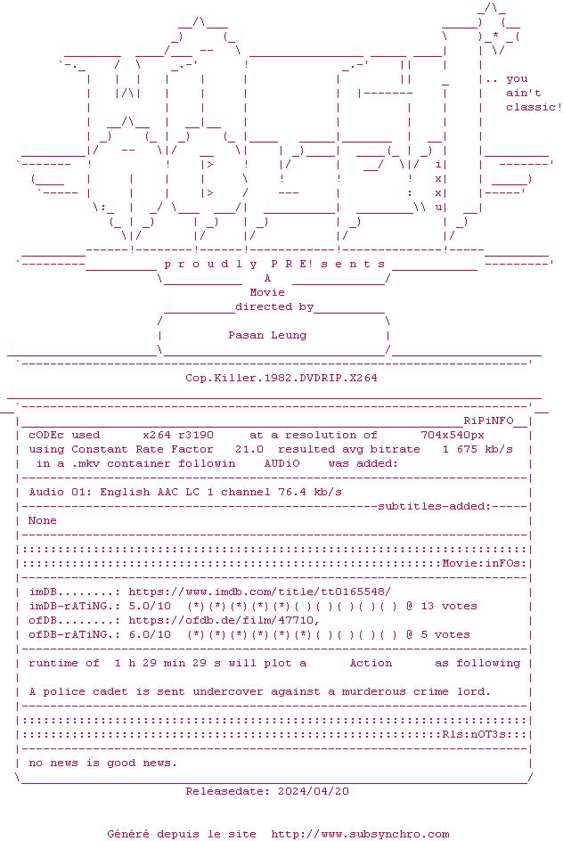 Voir le nfo de la release Cop.Killer.1982.DVDRIP.x264-WATCHABLE