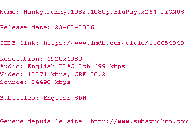 Telechargez le RSS « Fichier de la release Hanky.Panky.1982.1080p.BluRay.x264-PiGNUS »