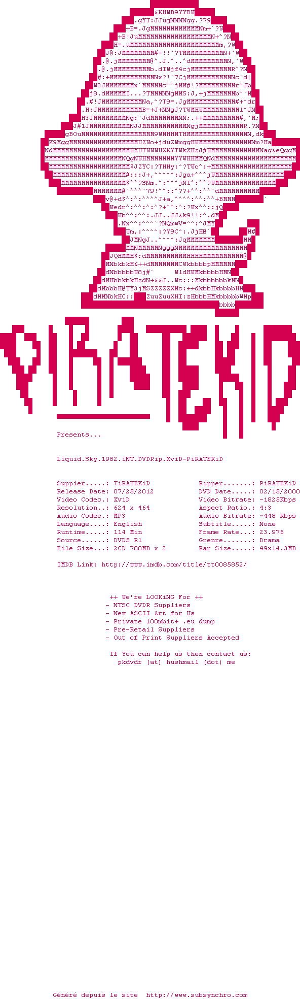 Voir le nfo de la release Liquid.Sky.1982.iNT.DVDRip.XviD-PiRATEKiD