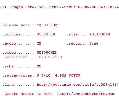 Telechargez le RSS « Fichier de la release Dragon.Lord.1982.BONUS.COMPLETE.UHD.BLURAY-4KDVS »