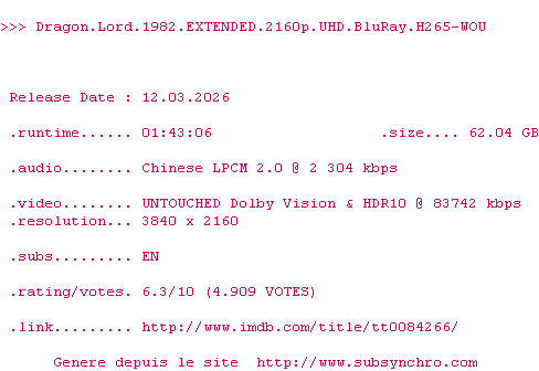 Telechargez le RSS « Fichier de la release Dragon.Lord.1982.EXTENDED.2160p.UHD.BluRay.H265-WOU »