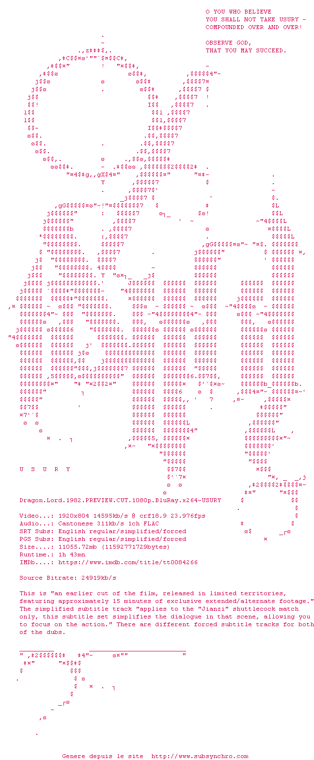Telechargez le RSS « Fichier de la release Dragon.Lord.1982.PREVIEW.CUT.1080p.BluRay.x264-USURY »