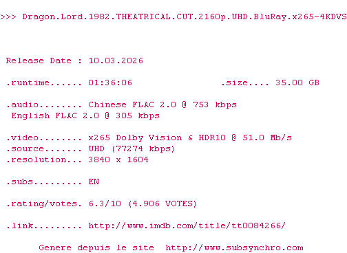 Telechargez le RSS « Fichier de la release Dragon.Lord.1982.THEATRICAL.CUT.2160p.UHD.BluRay.x265-4KDVS »