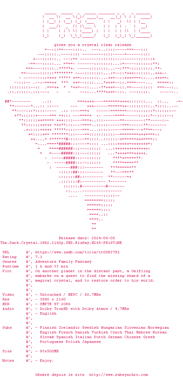 Voir le nfo de la release The.Dark.Crystal.1982.2160p.UHD.BluRay.H265-PRiSTiNE