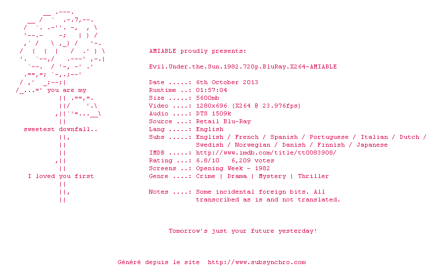 Voir le nfo de la release Evil.Under.The.Sun.1982.720p.BluRay.x264-AMIABLE
