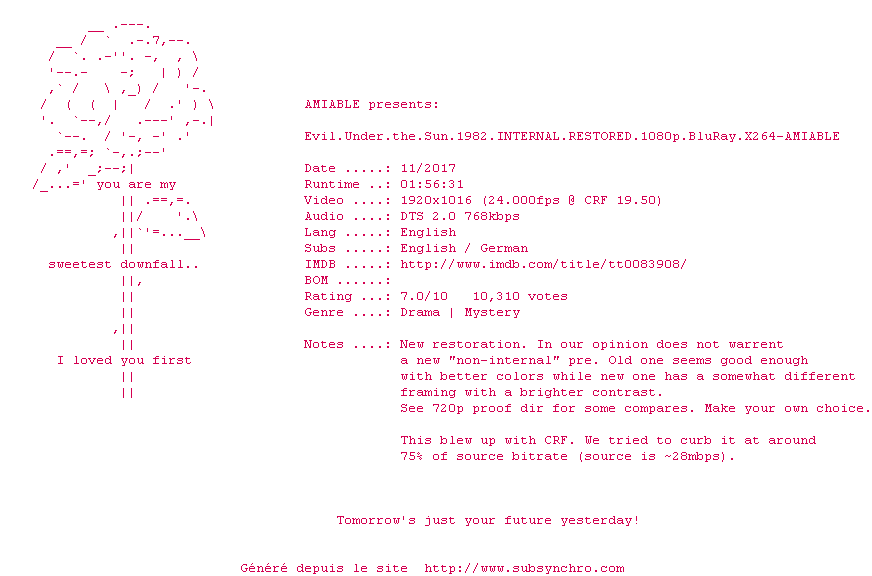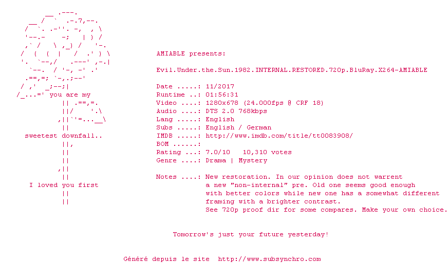 Voir le nfo de la release Evil.Under.The.Sun.1982.iNTERNAL.RESTORED.1080p.BluRay.x264-AMIABLE