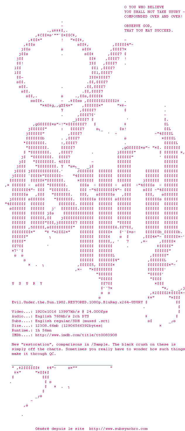 Voir le nfo de la release Evil.Under.The.Sun.1982.RESTORED.1080p.BluRay.x264-USURY