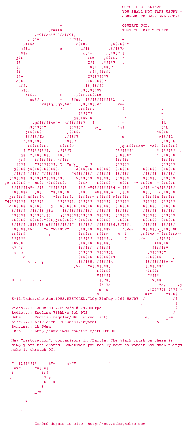 Voir le nfo de la release Evil.Under.The.Sun.1982.RESTORED.720p.BluRay.x264-USURY