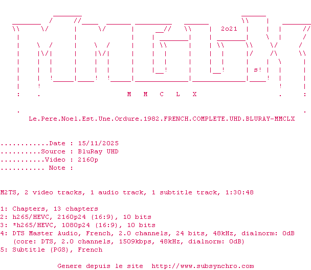 Voir le nfo de la release Le.Pere.Noel.Est.Une.Ordure.1982.FRENCH.COMPLETE.UHD.BLURAY-MMCLX
