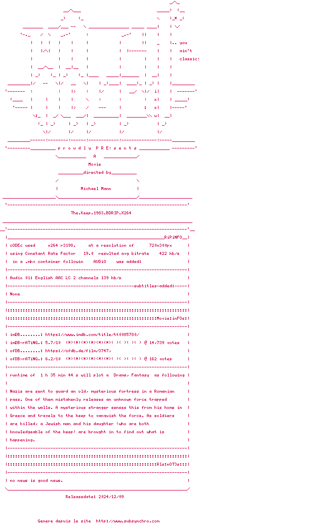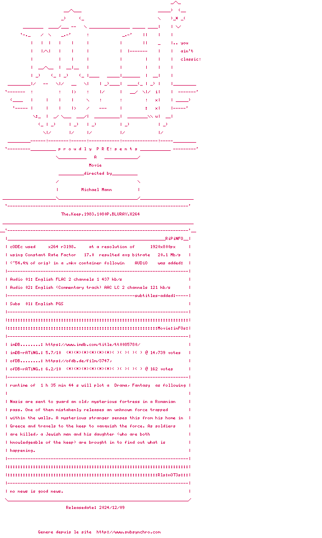 1941, au cœur des Carpates roumaines. Une unité de soldats nazis prend possession d’une mystérieuse forteresse isolée, malgré les avertissements du gardien local. Bientôt, des morts inexplicables frappent les occupants, révélant la présence d’une entité maléfique scellée dans les murs du sombre édifice. Alors qu’un furieux officier allemand cherche à percer l’énigme de ce lieu maudit, un érudit juif et sa fille, arrachés aux camps, se retrouvent contraints de devoir collaborer avec leurs tortionnaires pour élucider ce mystère...