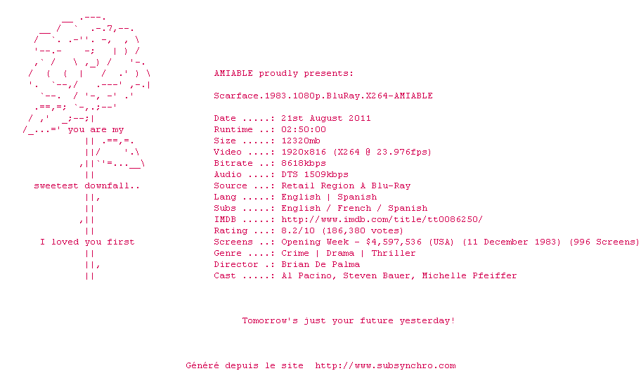 Voir le nfo de la release Scarface.1983.1080p.BluRay.x264-AMIABLE