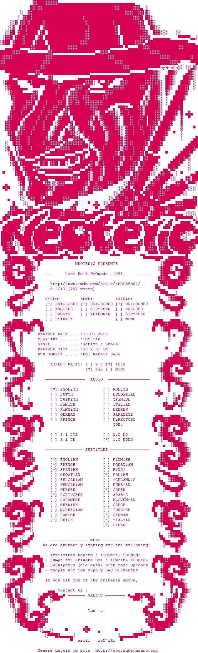 Voir le nfo de la release Lone.Wolf.McQuade.1983.PAL.MULTiSUBS.DVDR-NEOTERiC